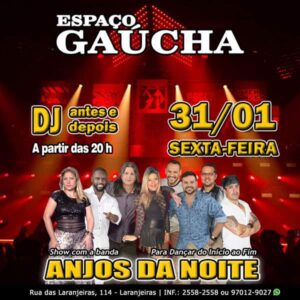 LISTA da REDE ÚNICA APRESENTAÇÃO SHOW IMPERDÍVEL ANJOS DA NOITE Espaço Gaucha Rua Das Laranjeiras, 214 Laranjeiras Sexta (31/01) ás 20H Nomes na Lista da REDE, pagam 20, (em dinheiro), direto na bilheteria.