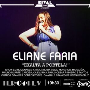 LISTA da REDE ÚNICA APRESENTAÇÃO SHOW ELIANE FARIA - EXALTA PORTELA Teatro Rival Rua Álvaro Alvim, 33 Centro – Metrô Cinelândia Terça (04/02) às 19H30 Nomes na Lista da REDE, pagam 20, direto na bilheteria.