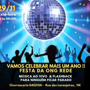 VAMOS CELEBRAR MAIS UM ANO FESTA da ONG REDE MÚSICA AO VIVO & FLASHBACK PARA NINGUÉM FICAR PARADO CHURRASCARIA GAUCHA Rua Das Laranjeiras, 114 - Laranjeiras Sexta (29/11) das 20H até as 00H30 Chegada a partir das 19H30 Banda, Dj, dançarinos e mesas Consumação a parte (rodízio - não é obrigatório) - venda de petiscos e pizzas INGRESSOS: