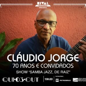 LISTA da REDE ÚNICA APRESENTAÇÃO IMPERDÍVEL CLÁUDIO JORGE CELEBRA OS 70 ANOS E CONVIDADOS SHOW SAMBA JAZZ DE RAIZ Teatro Rival Rua Álvaro Alvim, 33 Centro – Metrô Cinelândia Quinta (03/10) às 19H30 Nomes na Lista da REDE, pagam 20, direto na bilheteria