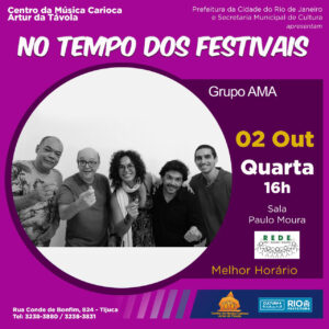 LISTA da REDE ÚNICA APRESENTAÇÃO IMPERDÍVEL NO TEMPO DOS FESTIVAIS - ANOS 60/70/80 Centro da Música Carioca Artur da Távola Rua Conde de Bonfim, 824 - Tijuca Quarta (02/10) às 16h Nomes na Lista da REDE, pagam 10, direto na bilheteria.