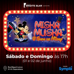 LISTA da REDE IMPERDÍVEL INFANTIL - LÚDICO MISKA MUSKA - O SHOW do MICKEY Teatro Brigitte Blair Rua Miguel Lemos, 51 - Loja H Copacabana Sábado às 17H Domingo às 17H Somente com o Nome na Lista da ong REDE, pagam 20, (EM DINHEIRO).