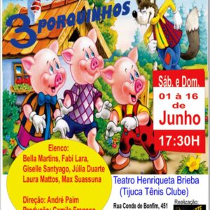 LISTA da REDE INFANTIL - LÚDICO AS AVENTURAS DOS 3 PORQUINHOS Teatro Henriqueta Brieba Tijuca Tênis Club Rua Conde de Bonfim, 451 Tijuca - Metrô Sans Peña Sábado e Domingo ás 17H30 Nomes na Lista da REDE, pagam 15, (em dinheiro), direto na bilheteria.