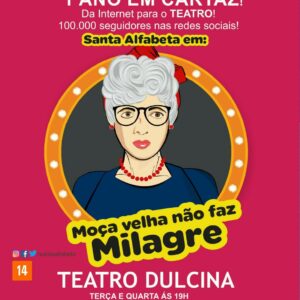 GRATUITO REDE COMÉDIA MOÇA VELHA NÃO FAZ MILAGRE Teatro Dulcina Rua Alcino Guanabara, 17 Centro - Metrô Cinelândia Terças e Quartas às 19H Nomes na Lista da REDE, direto na bilheteria.