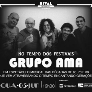 LISTA da REDE ÚNICA APRESENTAÇÃO NO TEMPO DOS FESTIVAIS - GRUPO AMA MUSICAL DAS DÉCADAS DE 60, 70 E 80 Teatro Rival Rua Álvaro Alvim, 33 Centro Metrô Cinelândia Quarta (05/06) às 19H30 Nomes na Lista da REDE, pagam 15, (em dinheiro), direto na bilheteria.