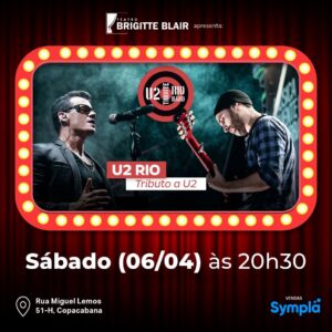 LISTA da REDE IMPERDÍVEL SHOW U2 RIO - TRIBUTO a U2 Teatro Brigitte Blair Rua Miguel Lemos, 51 - Loja H Copacabana Sábado (06/04) às 20H30 Somente com o Nome na Lista da ong REDE, pagam 25, (pode cartão)