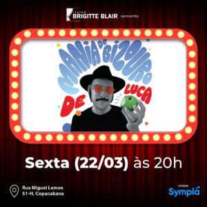 LISTA da REDE IMPERDÍVEL SHOW MANIA de BIZOURO DE LUCA Teatro Brigitte Blair Rua Miguel Lemos, 51 - Loja H Copacabana Sexta (22/03) às 20H Somente com o Nome na Lista da ong REDE, pagam 25, (pode cartão)