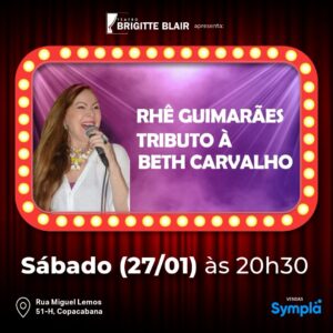 LISTA da REDE IMPERDÍVEL SHOW RHÊ GUIMARÃES - MTRIBUTO À BETH CARVALHO Teatro Brigitte Blair Rua Miguel Lemos, 51 - Loja H Copacabana Sábado às 20H30 Somente com o Nome na Lista da ong REDE, pagam 25, [pode cartão]