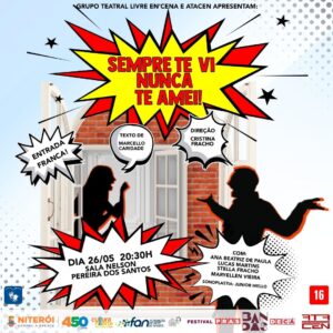 REDE CONVIDA TOTALMENTE GRATUITO IMPERDÍVEL ÚNICA APRESENTAÇÃO COMÉDIA SEMPRE TE VI NUNCA RE AMEI Sala Nelson Pereira dos Santos Av. Visconde do Rio Branco, 880 São Domingos Niterói Sexta (26/05) às 19H Somente com o Nome na Lista da ong REDE, direto na bilheteria
