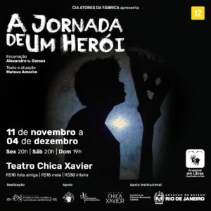 REDE CONVIDA TOTALMENTE GRATUITO IMPERDÍVEL TEATRO ARTE A JORNADA DE UM HERÓI Teatro Chica Xavier Rua Carlos de Carvalho, 53 Centro Sexta (02/12) às 20H Sábado (03/12) às 20H Domingo (04/12) às 19H Somente com o Nome na Lista da ong REDE, direto na bilheteria