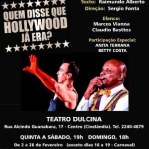 REDE CONVIDA TOTALMENTE GRATUITO IMPERDÍVEL COMÉDIA QUEM DISSE QUE HOLLYWOOD JÁ ERA ? Teatro Dulcina Rua Alcino Guanabara, 17 Cinelândia Quinta (23/02) às 19H Sexta (24/02) às 19H Sábado (25/02) às 19H Domingo (26/02) às 18H Somente com o Nome da Lista da ong REDE, direto na bilheteria.