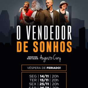 LISTA da REDE IMPERDÍVEL DA OBRA BEST SELLER DE AUGUSTO CURY O VENDEDOR DOS SONHOS Teatro Clara Nunes 3º Piso do Shopping da Gávea Gávea Sexta (25/11) às 20H Sábado (26/11) às 20H Somente com o Nome da Lista da ong REDE, pagam 30, {EM DINHEIRO}