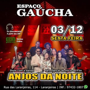 LISTA da REDE SHOW – IMPERDÍVEL - FLASH BACK COM PISTA DE DANÇA BANDA ANJOS DA NOITE Espaço Gaucha Rua Das Laranjeiras, 114 Laranjeiras Sexta (03/12) às 20H30 Somente com o Nome da Lista da ong REDE, pagam 25, {EM DINHEIRO}.