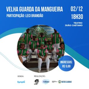 LISTA da REDE ÚNICA APRESENTAÇÃO SHOW - IMPERDÍVEL VELHA GUARDA DA MANGUEIRA Participação Especial: LECI BRANDÃO Teatro João Caetano Praça Tiradentes s/n Cerntro Quinta (02/12) às 18H30 Somente com o Nome da Lista da ong REDE, pagam 5, (EM DINHEIRO).