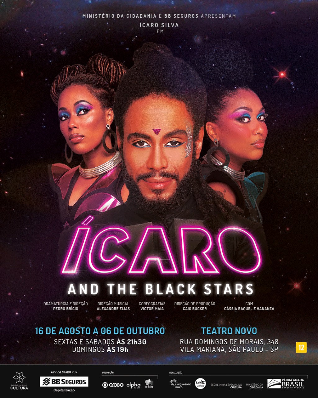 Após duas temporadas de sucesso no Rio de Janeiro e em turnê nacional, o ator Ícaro Silva, acompanhado por Cássia Raquel e Hananza, as black stars, estreiam dia 16 de agosto, sexta-feira, às 21h30, no Teatro Novo, o espetáculo musical Ícaro And The Black Stars.