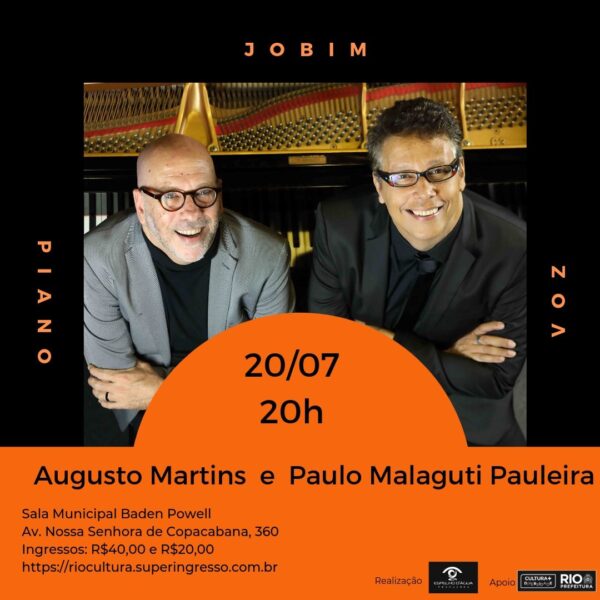 Tom Jobim, piano e voz. Ingredientes perfeitos para um belo show e CD. Voz de sobra. Dessas raras de se encontrar por aí. Timbre grave, amplitude tonal, elegância nas improvisações, Augusto Martins é um carioca que soube mixar o suingue das rodas de samba com o classicismo das aulas de canto. Depois de 7 discos lançados com participações de nomes como Ivan Lins, Beth Carvalho, Seu Jorge, Yamandú Costa e Leila Pinheiro, chega ao álbum “Piano, Voz e Jobim”. Acompanhado de Paulo Malaguti Pauleira, vocalista do MPB 4, arranjador e pianista que já tocou com Simone, Adriana Calcanhoto, Nana Caymmi e João Donato, o duo injeta uma sonoridade jazzística muito original e paradoxalmente respeitosa dessa obra irretocável. Nela passeiam com rara elegância e desenvoltura. No dia 20 de julho de 2019, às 20h, o duo chega para mais um show na Sala Baden Powell reverenciando o grande mestre da Música Brasileira, no ano em que se completam 25 anos de sua ausência entre nós.